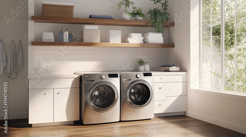 Modern laundry room featuring stylish washing machines and natural light in a spacious design