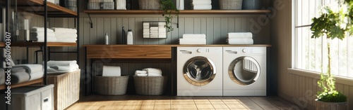 Modern laundry room with shelves, storage, and plants, designed for functionality and comfort.