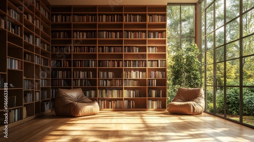 Modern library or bookstore interior with Learning and coworking space,relax zone,Library with rows of bookshelves arranged,school,university,shared desk and chairs,panoramic window.