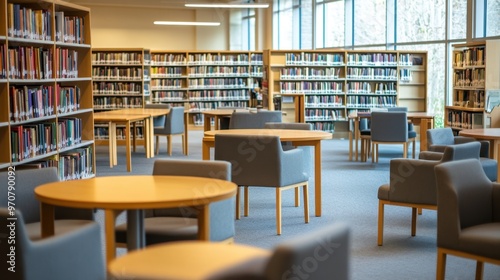 Modern library or bookstore interior with Learning and coworking space,relax zone,Library with rows of bookshelves arranged,school,university,shared desk and chairs,panoramic window.