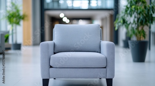 Modern light gray upholstered armchair in a spacious office lobby