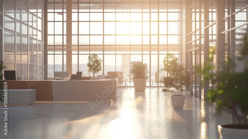 Modern light-filled office interior with panoramic windows and soft blurred background, showcasing elegant contemporary design and natural lighting.