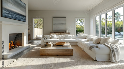 Modern Living Room Design with White Sofa, Fireplace, and Natural Light