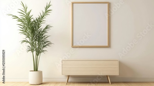 Modern living room featuring a blank poster frame, stylish wooden cabinet, potted plant, and minimalist decor. Ideal for wall art and interior design mockups.