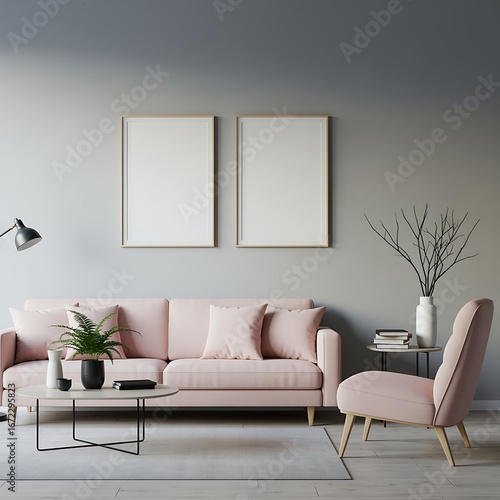 Modern Living Room Interior Design Pink Sofa and Mockup Frames for Artwork Exhibition Home Decor Contemporary Style Apartment Beautiful Minimalist Aesthetics