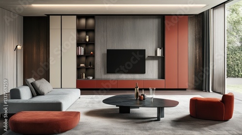 Modern living room interior design, TV wall unit, relaxation
