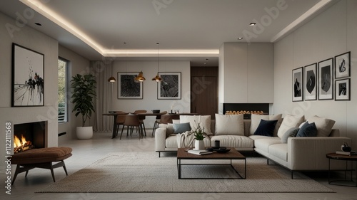 Modern living room interior design with beige sofa, fireplace, and dining area.