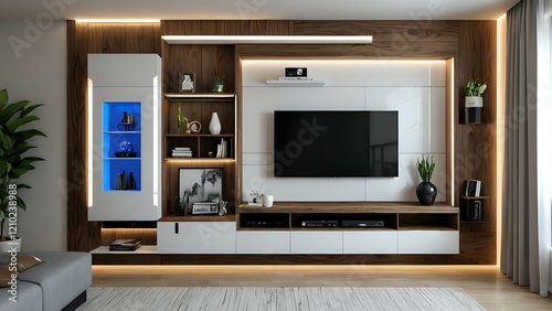 Modern living room interior design with stylish built-in media unit, featuring sleek white and dark wood finishes, integrated lighting, and a large flat-screen TV.