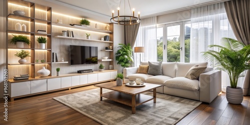 Modern Living Room Interior Design with Wooden Flooring, White Sofa, and Plants, interior design , living room , modern design