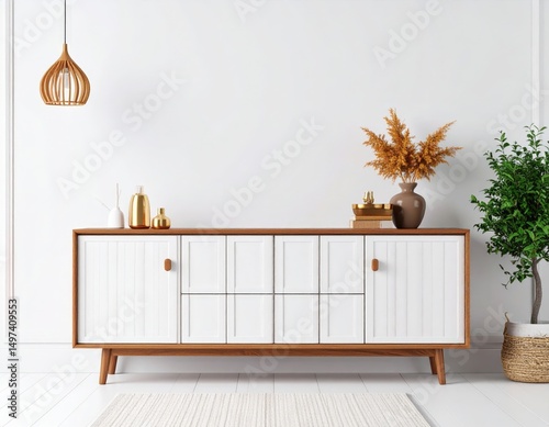Modern living room interior featuring a stylish wooden cabinet, decorative plants, and ambient lighting