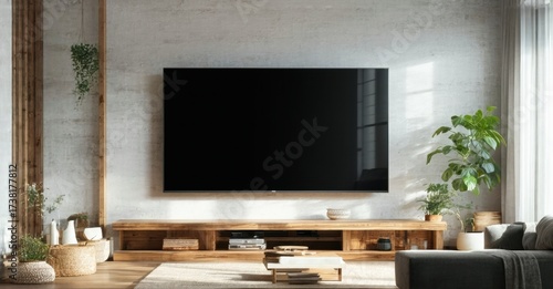 Modern living room interior. Neutral tones, wood furniture, plants create calm atmosphere. Television dominates wall space.