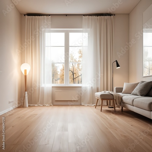 Modern Living Room Interior with Large Window and Wooden Floor