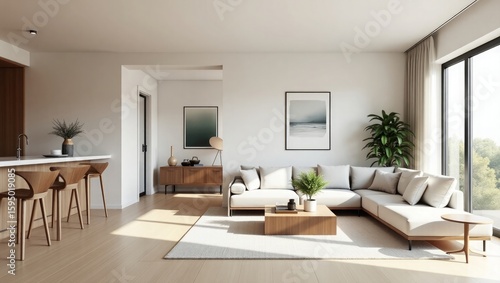 Modern Living Room Interior with White Sofa Wooden Furniture and Natural Light
