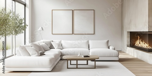 Modern living room with a cozy white sectional sofa, minimalist decor, and a warm fireplace creating a serene atmosphere.