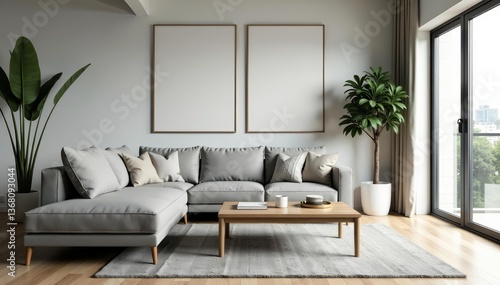Modern living room with grey couch, wooden table, and large windows, home, contemporary