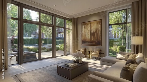 Modern Living Room with Large Windows and Serene Garden View