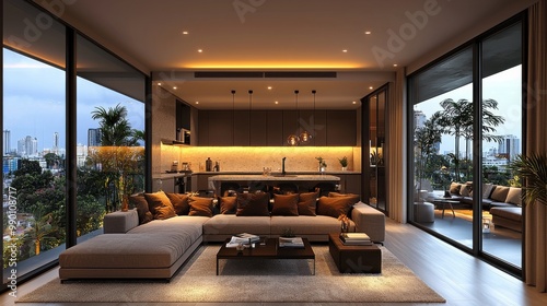 Modern living room with large windows overlooking the city skyline in the evening light, showcasing a stylish and cozy interior