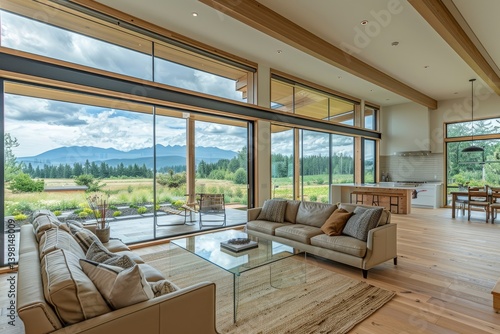 Modern living room with large windows showcasing a scenic landscape of mountains and greenery