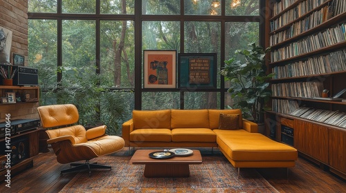 Modern Living Room with Mustard Yellow Sectional Sofa and Lush Greenery View