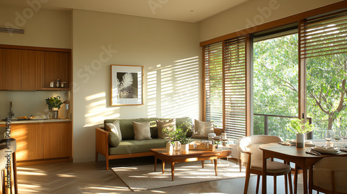 modern living room with natural light, featuring green sofa, wooden furniture, and large windows. space is inviting and stylish, perfect for relaxation