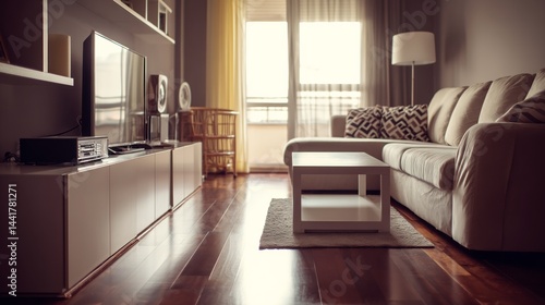 Modern living room with simple furniture, bathed in natural light. Minimalist elegance in a serene home space.