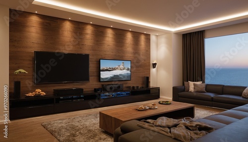 Modern living room with sofa and television a living room with a couch, chair, table and fireplace in the corner of the room with a large window overlooking the snow covered forest. 2