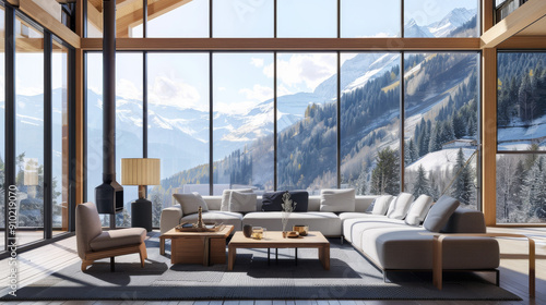 Modern living room with vast windows opening to spectacular snow-capped mountain views, blending luxury and nature seamlessly.