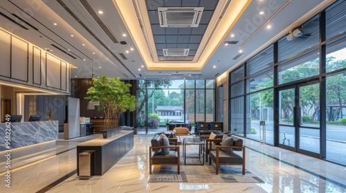 Modern lobby interior design with elegant furniture and natural light