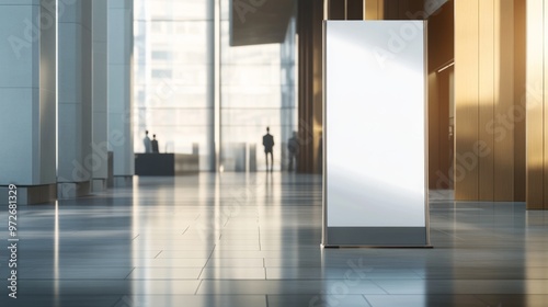 Modern lobby interior with sleek design elements and people in the background during late afternoon light in a contemporary office building