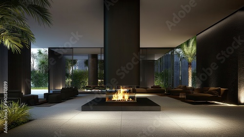 Modern lounge with sleek design and cozy fireplace, surrounded by greenery, perfect for relaxation and social gatherings.