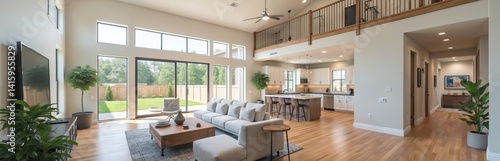 Modern luxury home living room with hardwood floors, vaulted ceiling, kitchen, second story loft. Spacious living room interior with large windows, sofa, green backyard view. New house, contemporary