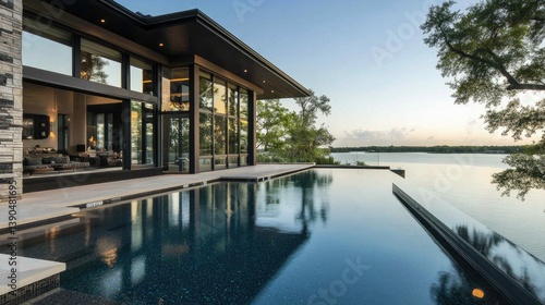 Modern luxury home with stunning pool and lake view during sunset, showcasing architecture and serene outdoor living space