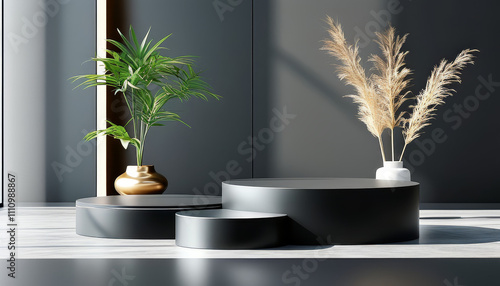 Modern luxury product display podium mock up with a high-tech look, neon lights, plants, luxury interior, empty podium and product pedestal, ad, podium platform, product presentation space