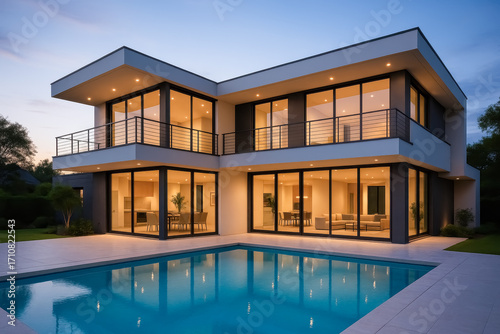 Modern luxury villa with large glass windows and pool illuminated at dusk, showcasing elegant contemporary architecture and warm interior lighting.