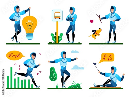 Modern Man Happy Social Life and Active Lifestyle Trendy Flat Vector Concepts Set. Guy Waiting Transport on Bus Stop, Playing with Dog, Listening Music, Jogging Outdoors, Shooting Selfie Illustrations