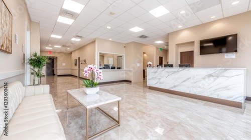 Modern medical clinic waiting area; calm atmosphere, marble reception desk, comfortable seating. Use healthcare marketing