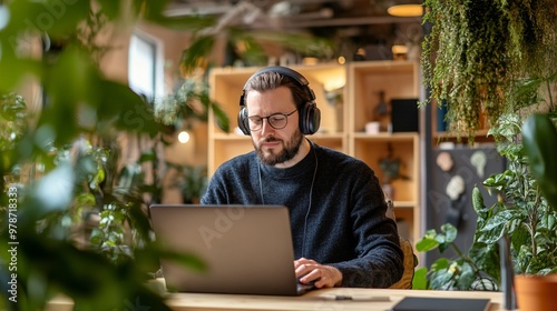Modern Men freelance workspace: Concentrated freelancer in coworking space with headphones, focused on laptop