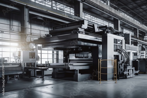 Modern metal industrial machinery with steel details illustrated in a contemporary factory building. Generative AI