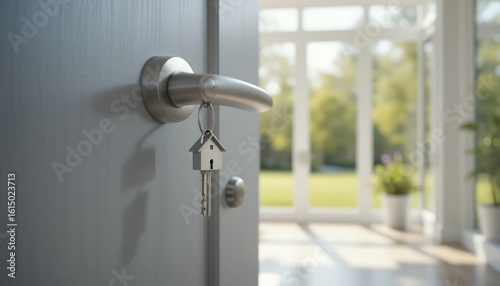 Modern metallic door handle with house shaped key in bright home entrance area