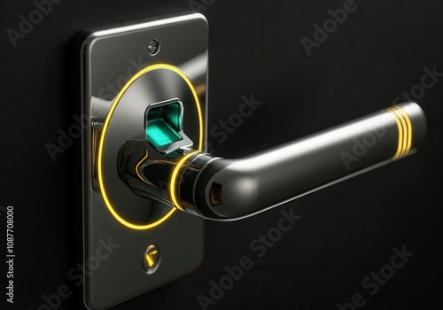 Modern metallic door handle with integrated fingerprint scanner glowing on a black background