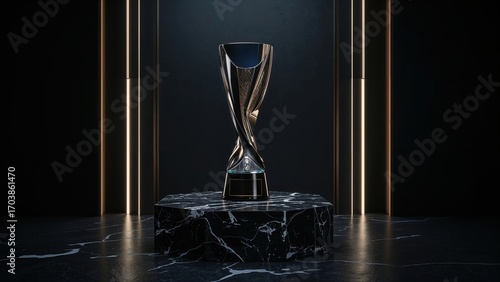 Modern metallic trophy on black marble pedestal in dark futuristic room with vertical lighting accents