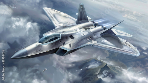 modern military fighter jet airplane flying surrounded by fire and smoke from explosion, against blue sky background aerial view of combat war plane performing battle maneuver