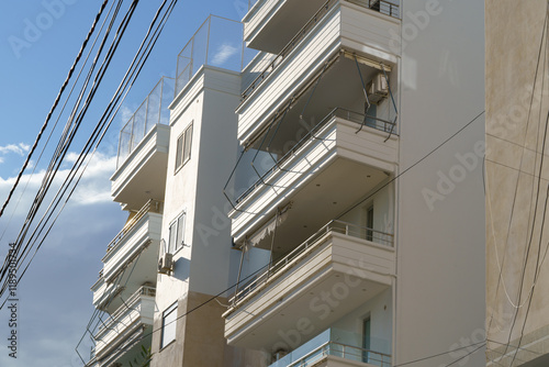 Modern minimalist apartment building in Mediterranean style with air conditioning in Albania on the sea coast. Concept of selling a house abroad, renting apartments