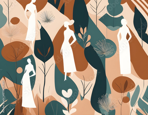 Modern minimalist art prints featuring abstract floral patterns and female silhouettes, perfect for a mid-century boho aesthetic background