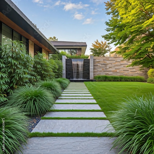 modern minimalist backyard design with waterfall feature and stone pathway