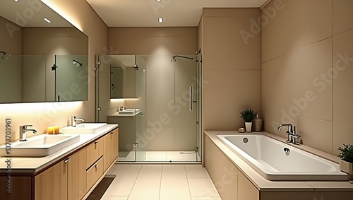 Modern minimalist bathroom with a warm neutral palette, featuring a spacious layout, glass-enclosed bathtub, double vanity, soft lighting, and serene decor accents.
