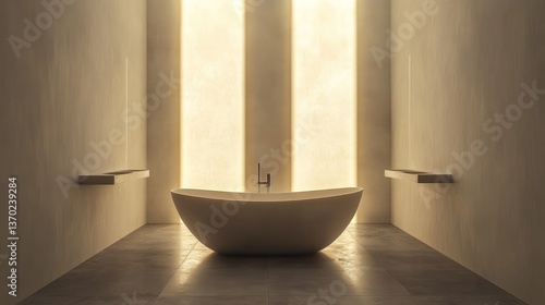 Modern minimalist bathroom with freestanding tub, bright light, and simple design. Possible use Stock photo for interior design, architecture, or spa
