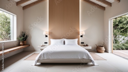 modern, minimalist bedroom with a neutral color palette. The room features a large bed with white bedding, centered against a light wood accent wall with integrated lighting