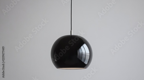 Modern minimalist black pendant light suspended above a plain white background with soft reflections.