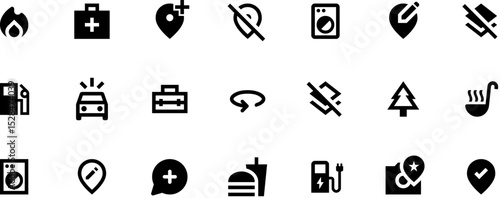 Modern minimalist black vector icons for mobile apps, white background, simple 2D flat design, high resolution web elements, professional graphics